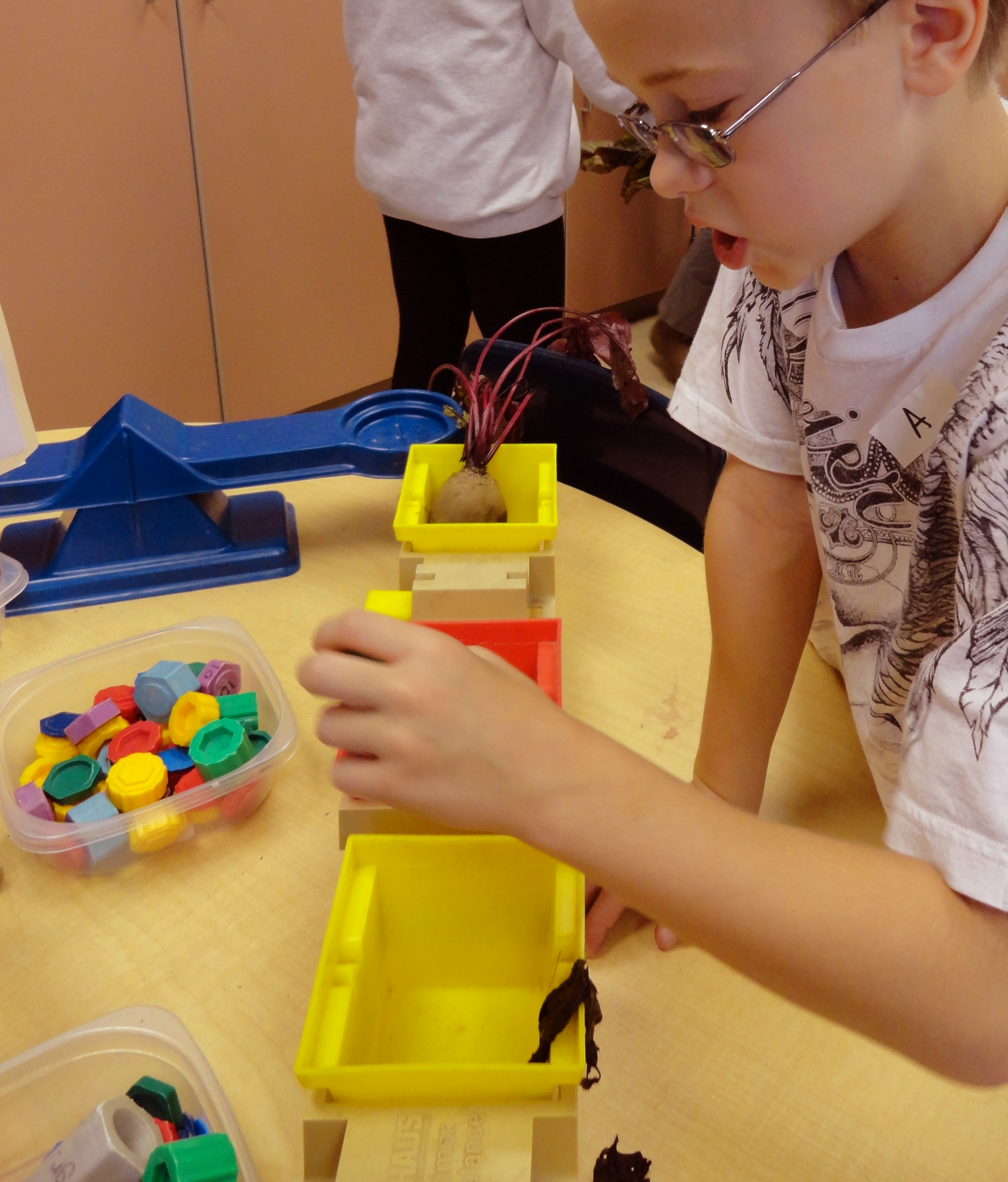 In this observation lab students are introduced to basic measuring tools: metric ruler, metric tape measure, balance scale and gram weights. The example lesson is drawn from a second grade class who have been presented with fresh beets to observe. However, this lesson can be done at any grade level using any type of engaging object that has measurable variability within a shared unity of appearance or form, such as apples, clam shells, corncobs, feathers, hot wheel cars, keys, leaves, lemons, nuts, seeds, pumpkins, rocks, worms, and so on. The lesson objects should be close to the same size. There should be one object for each child.